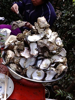 その後はこれも恒例の牡蠣を焼いて食う儀式。牡蠣を開くのは力のいる作業なので、女性陣は食べる専門です。
